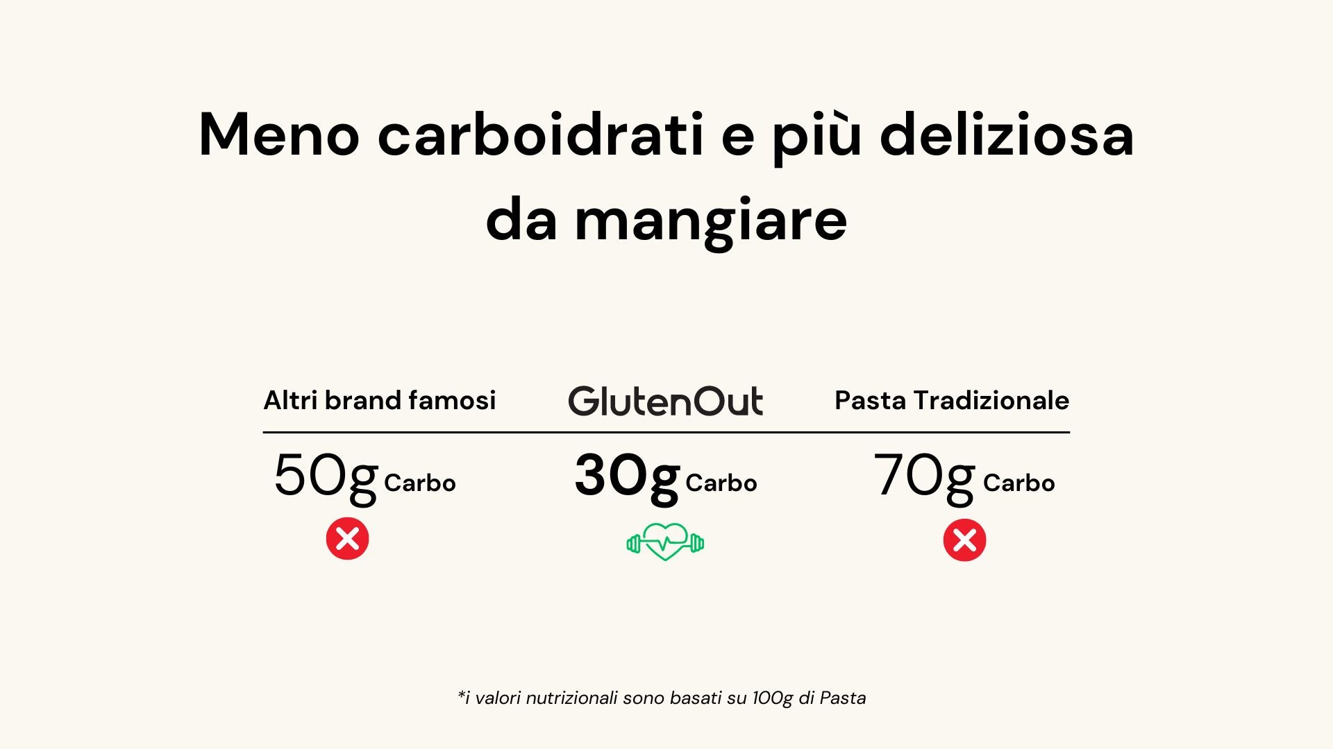 La nostra pasta GlutenOut è un'opzione a basso contenuto di carboidrati (30grammi pogni 100g di pasta), ideale per coloro che cercano di ridurne il consumo nell'alimentazione quotidiana.